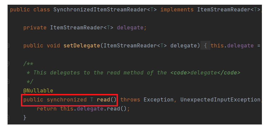 - 데이터를 소스로부터 읽어오는 역할이기 때문에 스레드마다 중복해서 데이터를 읽지 않도록 동기화가 보장되어야 합니다.