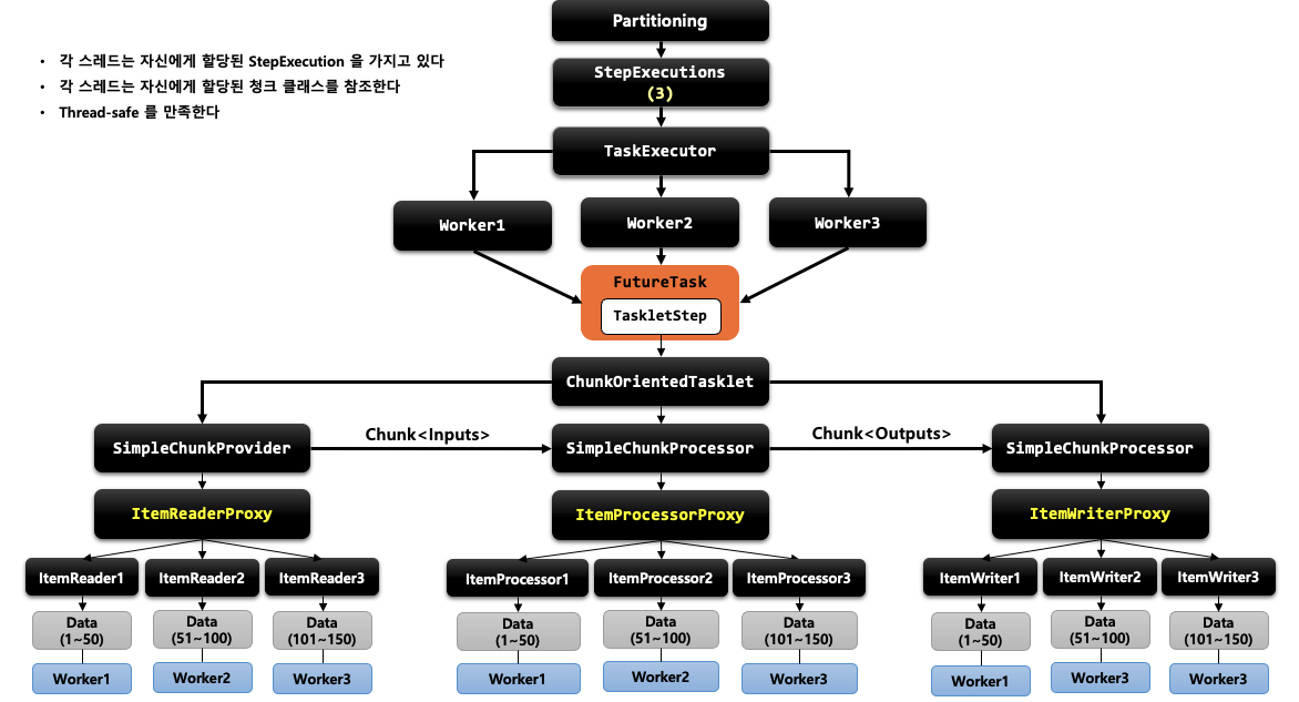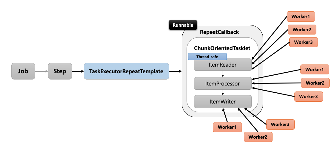 - Step 내에서 멀티 스레드로 Chunk 기반 처리가 이뤄지는 구조 입니다.