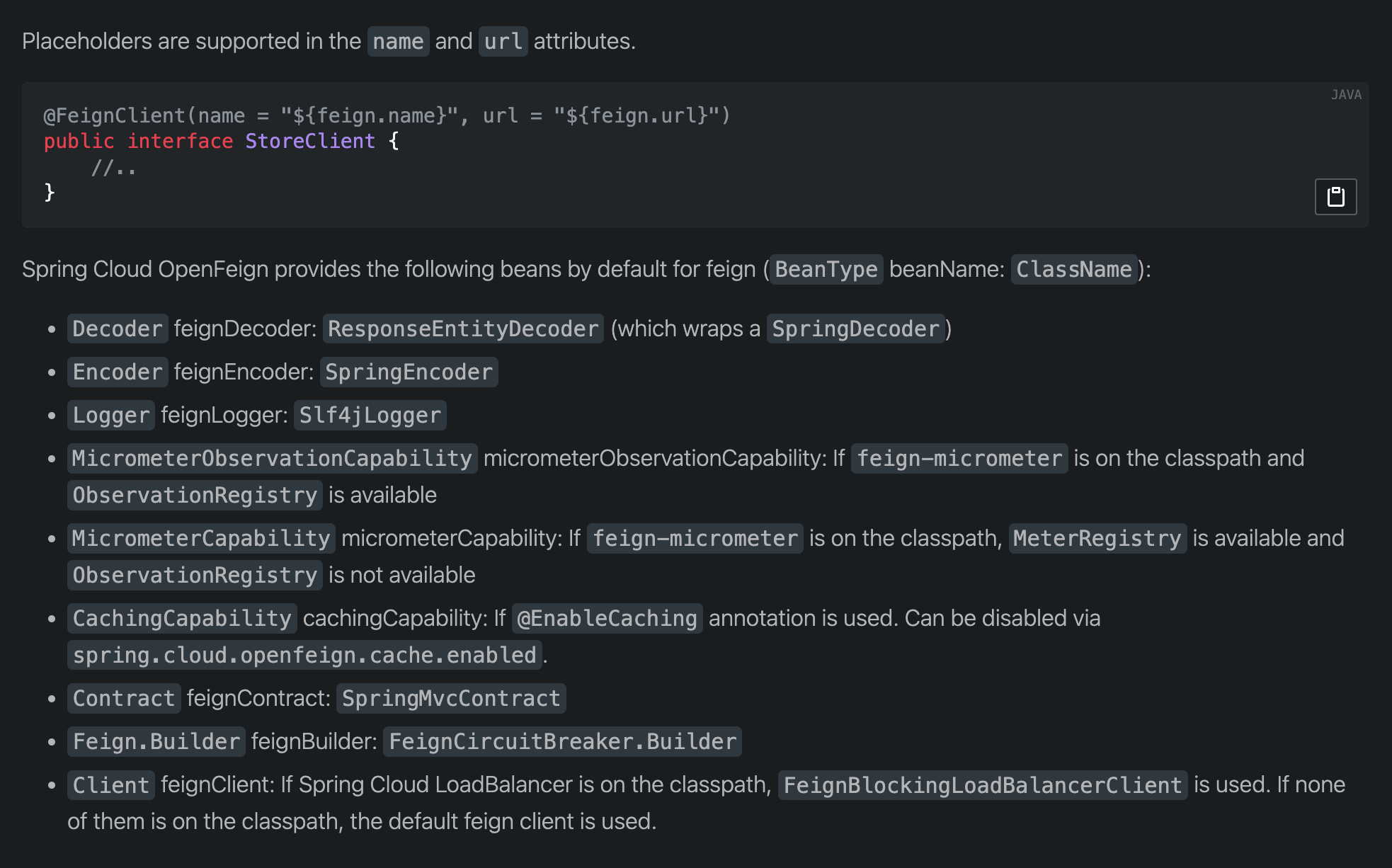 이외의 추가적인 client에 대한 properties는 org.springframework.cloud.openfeign.support.FeignHttpClientProperties에서 확인할 수 있습니다. 그리고 해당 properties를 사용하여 client를 만드는 과정은 org.springframework.cloud.openfeign.FeignAutoConfiguration 클래스에서 확인할 수 있습니다. 특정 client에 대한 설정이 아닌 global 설정은 default에서 설정할 수 있습니다.