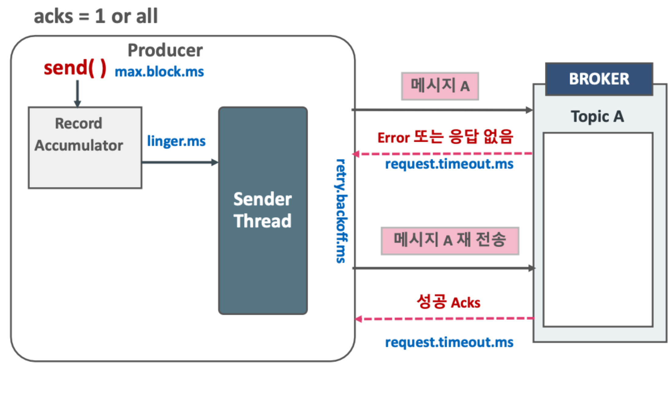 - 프로듀서가 브로커로부터 에러를 받고 난 뒤 재전송을 시도하는 횟수를 지정합니다.