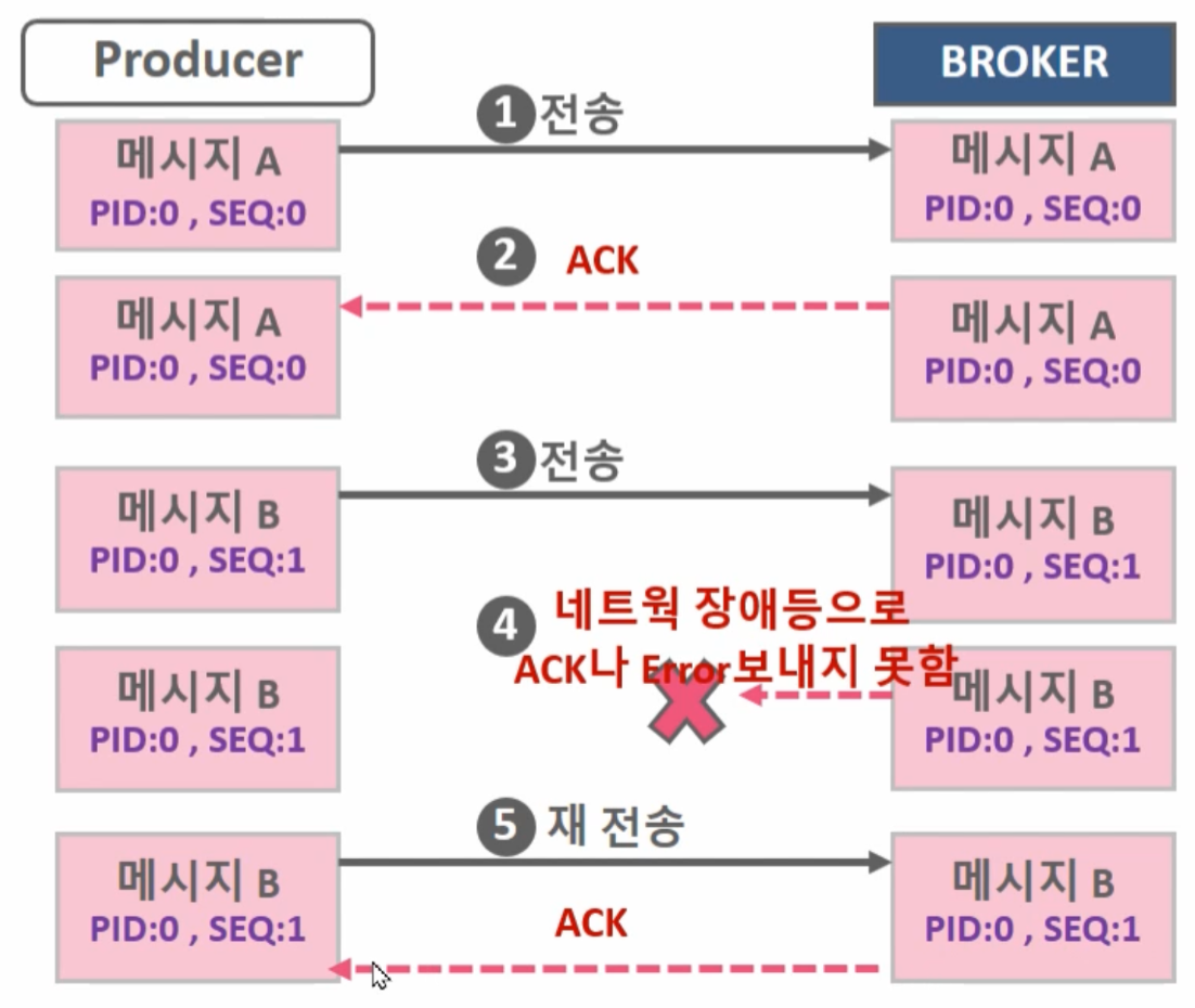 프로듀서에서 데이터를 전송하고 브로커에서 데이터를 잘 받았으나 ack 응답이 네트워크 장애 등으로 인해 유실되었을 경우, 프로듀서는 브로커부터 ack 응답을 받지 못했기 때문에 재시도를 수행할 수 있습니다. 이 경우에 브로커에 중복된 메시가 전송되는 이슈가 발생하게 됩니다. 이를 해결하기 위해 프로듀서는 브로커로 메시지를 전송할 때 producerId(PID)와 sequence를 Header에 저장하여 전송합니다. 메시지 Sequence는 메시지 고유한 번호이고 0부터 시작하여 순차적으로 증가하나 producer가 기동시마다 새롭게 생성됩니다. 이를 활용하여 브로커에서는 메시지 sequence가 중복되면 메시지를 기록하지 않고 ack만 응답하게 됩니다.