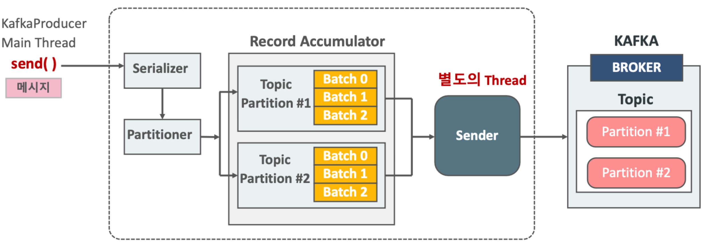 ProducerRecord -> send 호출 -> Partitioner -> Accumulator 내부에 토픽별로 배치를 만들어 저장 -> sender -> 카프카 클러스터