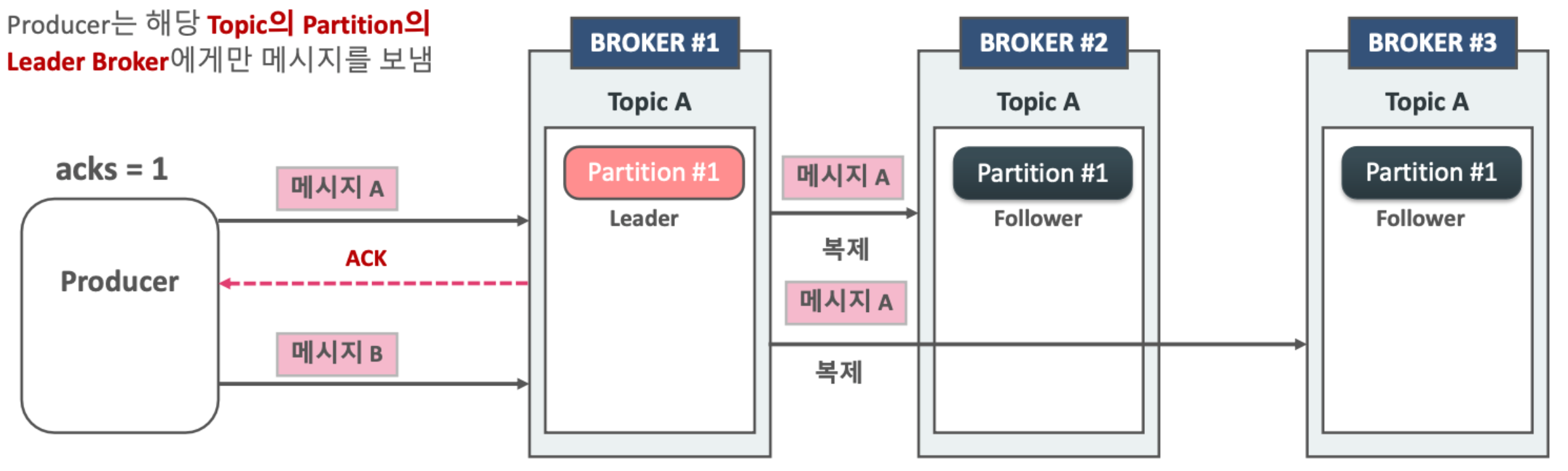 프로듀서가 보낸 데이터가 리더 파티션에만 정상적으로 적재되었는지 확인합니다. 적재되지 않았다면 재시도할 수 있습니다. 리더 파티션에 적재됐음을 보장하더라도 데이터는 유실될 수 있습니다. 복제 개수가 2이상이라면 팔로워 파티션에 데이터가 복제되기 직전에 리더 파티션에 문제가 발생하면 동기화되지 못한 일부 데이터가 유실되기 때문입니다.