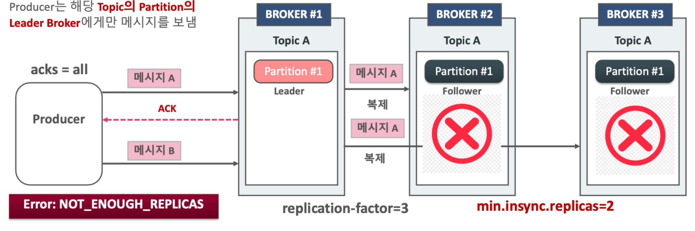- replicas가 3개로 구성되어 있고 acks가 all이더라도 이 옵션이 1로 되어있다면 리더만 메시지를 수신해도 조건이 충족되어 ack를 응답