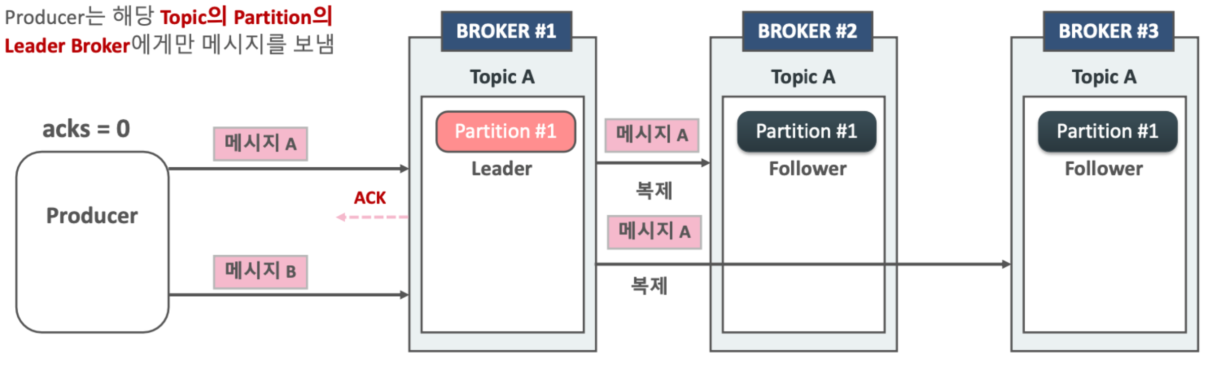 프로듀서가 리더 파티션으로 데이터를 전송했을 때 리더 파티션으로 데이터가 저장되었는지 확인하지 않는다는 뜻입니다. 리더 파티션은 데이터가 저장된 이후에 데이터가 몇 번째 오프셋에 저장됐는지 리턴하는데, 이에 대해 응답을 받지 않는다는 의미입니다. 이때는 프로듀서가 전송 하자마자 데이터가 저장되었음을 가정하고 다음으로 넘어가기 때문에 데이터 전송 실패여부를 알 수 없기에 retries 옵션값도 무의미합니다. 덕분에 전송 속도는 가장 빠르고 데이터가 일부 유실되더라도 전송속도가 중요한 경우 사용합니다.