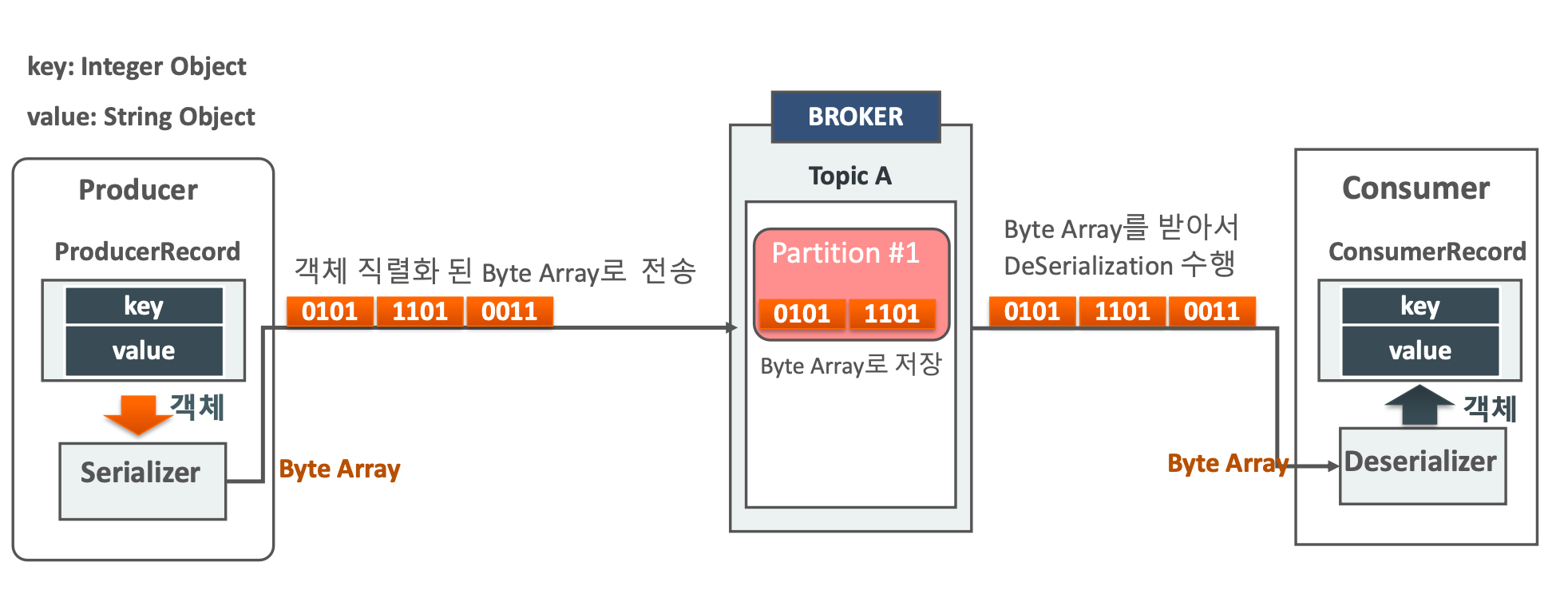 프로듀서는 보내는 객체를 직렬화화여 바이트 배열 형태로 브로커로 전송합니다. 브로커는 파티션에 바이트 배열 형태로 저장하고 컨슈머는 바이트 배열을 받아서 역직렬화로 객체를 복원합니다.