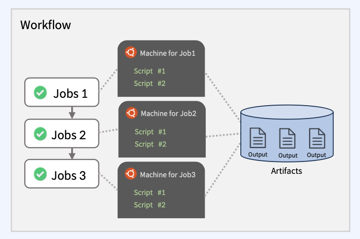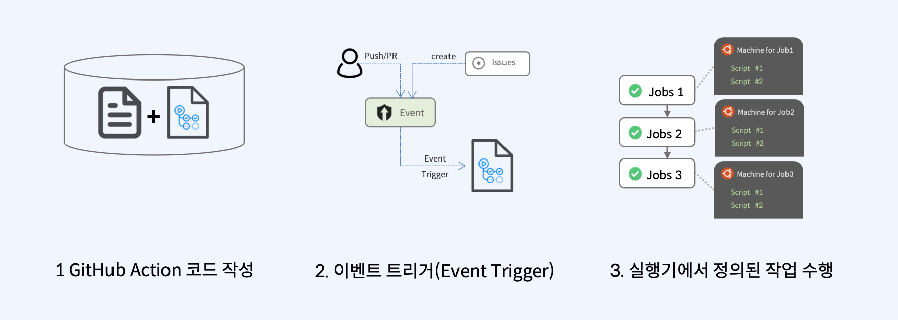 - runner : job별 별도의 공간에서 실행하는 작업 공간에 대한 정의로 작업 간 내용 공유는 기본적으로 제공되지 않습니다.