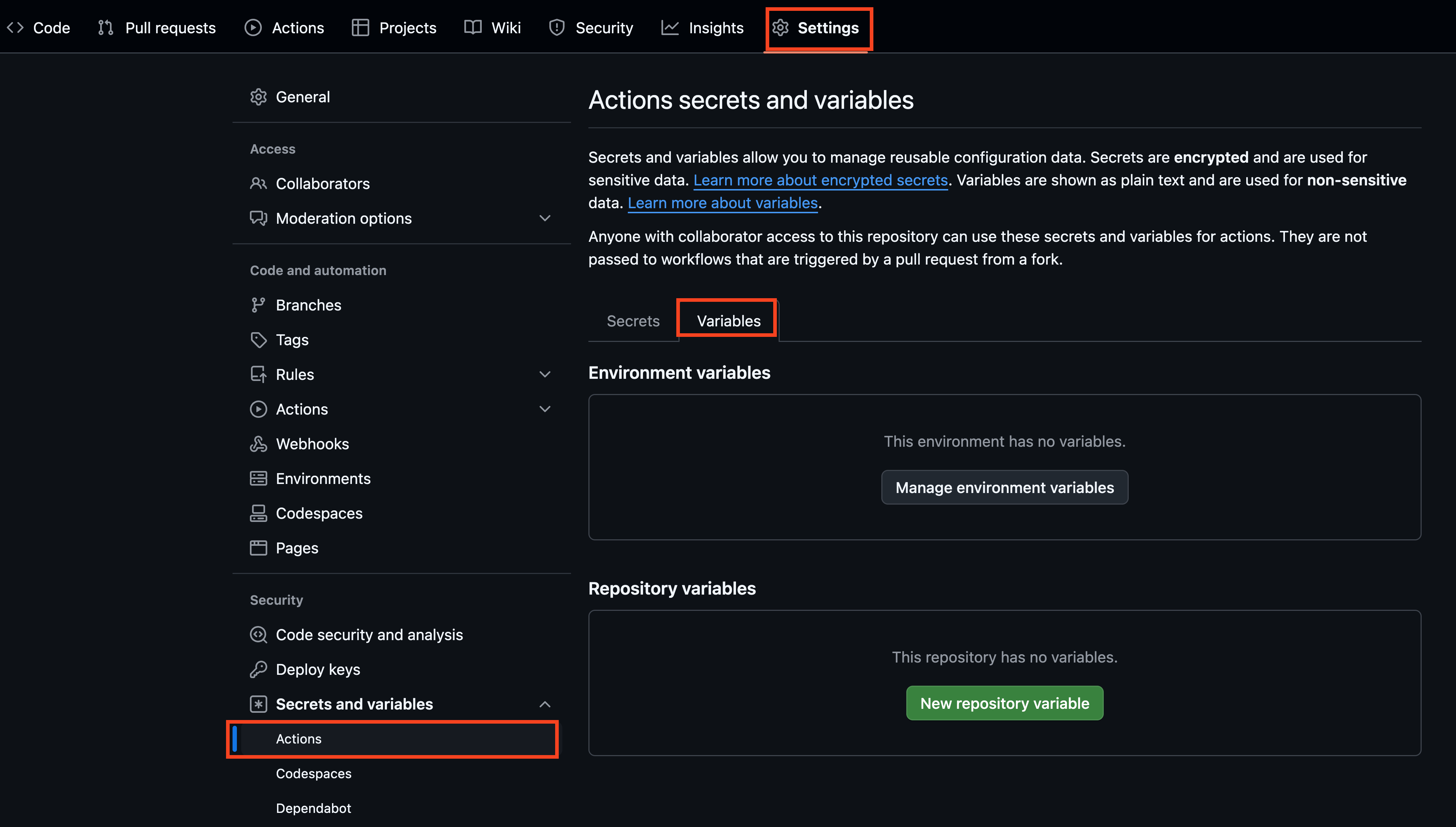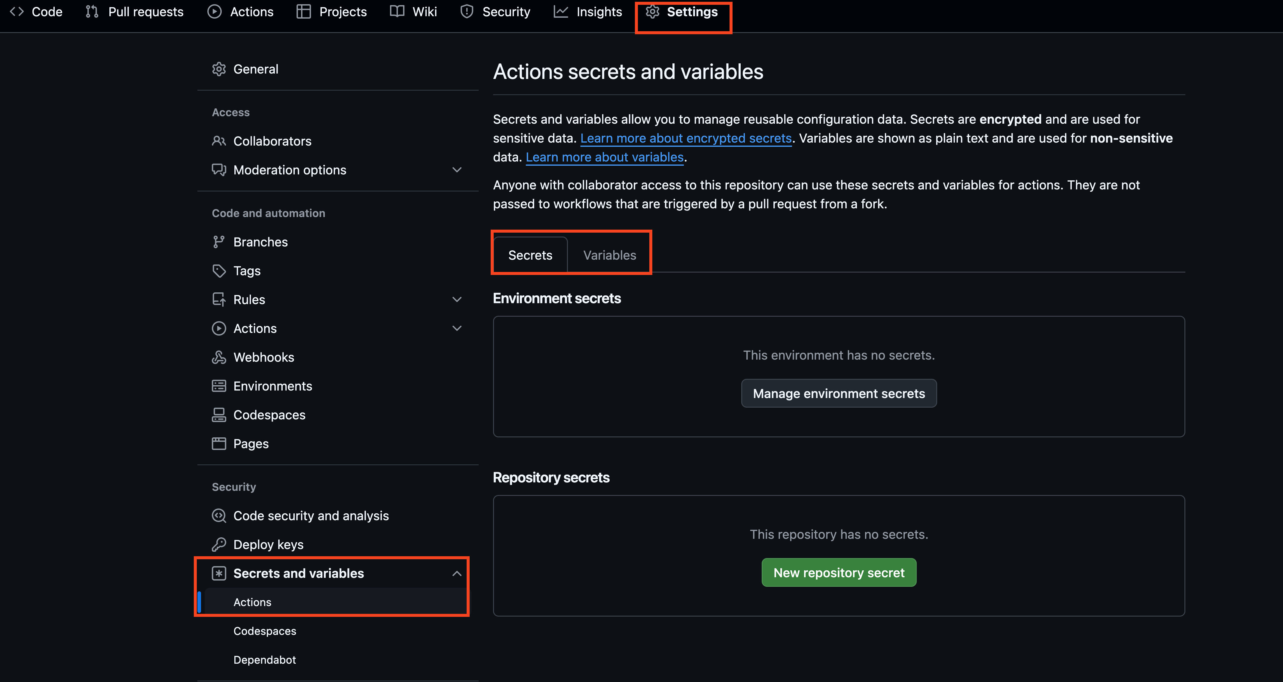 - workflow 파일에 env 키로 정의하여 단일 workflow에서 정의할 수도 있고 github organization이나 repository에서 정의하여 전체 workflow 내에서 global 하게 사용할 수도 있습니다.