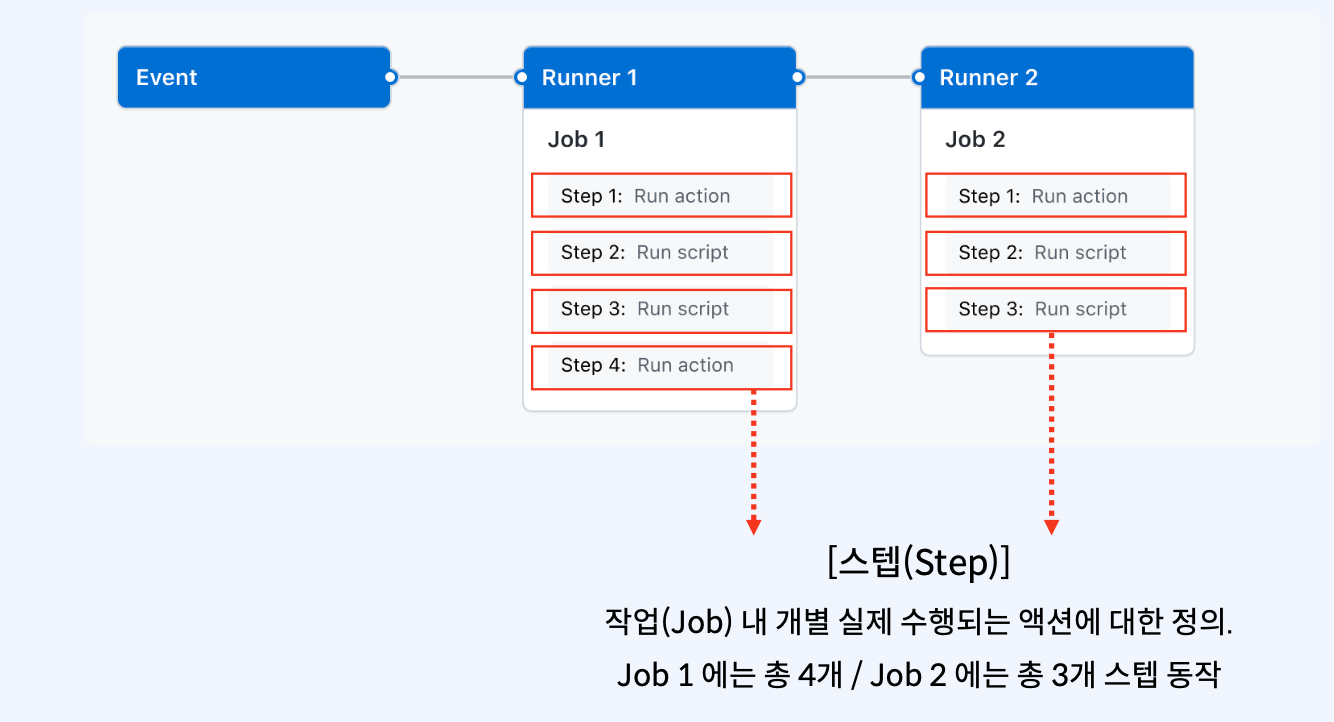 - step : job 내 개별 수행되는 액션에 대한 정의